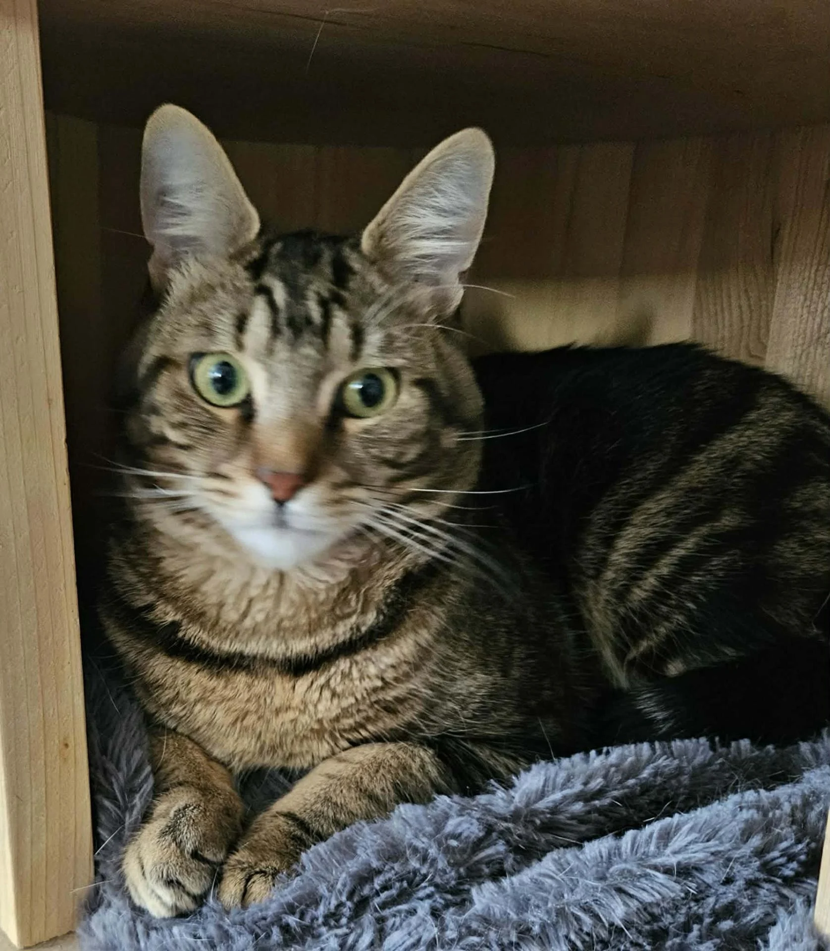 Moi c'est VESPA, née le 07/06/2024. Je suis une petite femelle tigrée avec le pelage tout doux, et je suis déjà stérilisée.